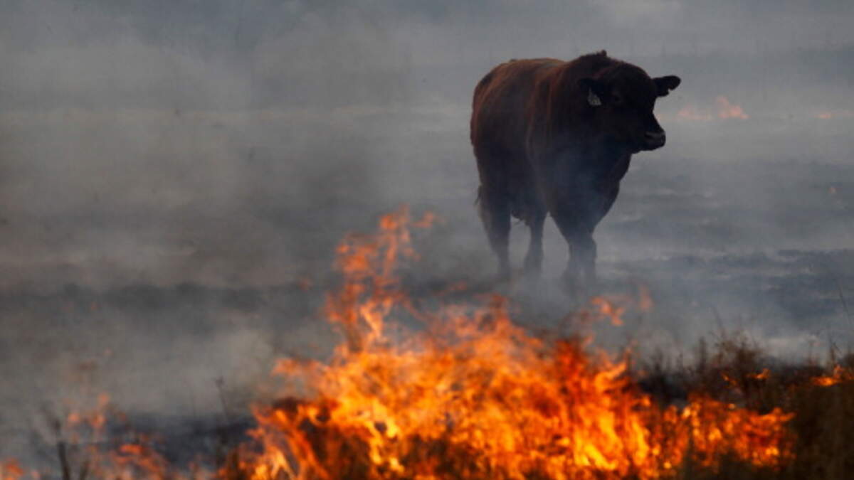 California firefighters battling the Lake Fire outside Los Angeles run upon a bull who doesn't get that these guys are just trying to help! Photo: Getty Images